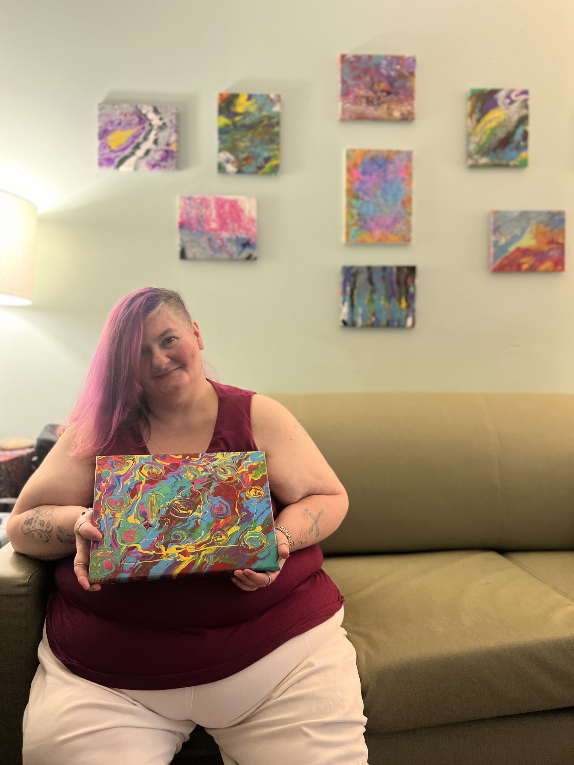 One year later, Kathaleen’s physical and mental health has drastically changed. She’s developed a passion for painting and loves sharing her artwork with others. She’s been sober for two years, her diabetes is under control, she’s losing weight, and her IBS has completely disappeared. Kathaleen is especially grateful for the daily support from her best friend, Jake, who helps with chores and errands, and for her Case Manager, Sunni, who has been with her since day one.