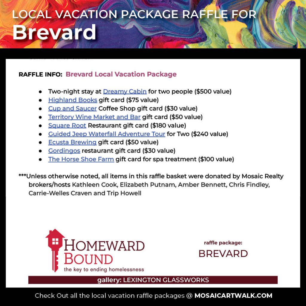 This year, we are partnering with our friends at Lexington Glassworks as a part of the gallery walk. Come enjoy drinks, peruse the locally made hand-blown glass art, and purchase raffle tickets to win an all-inclusive Brevard weekend vacation package!