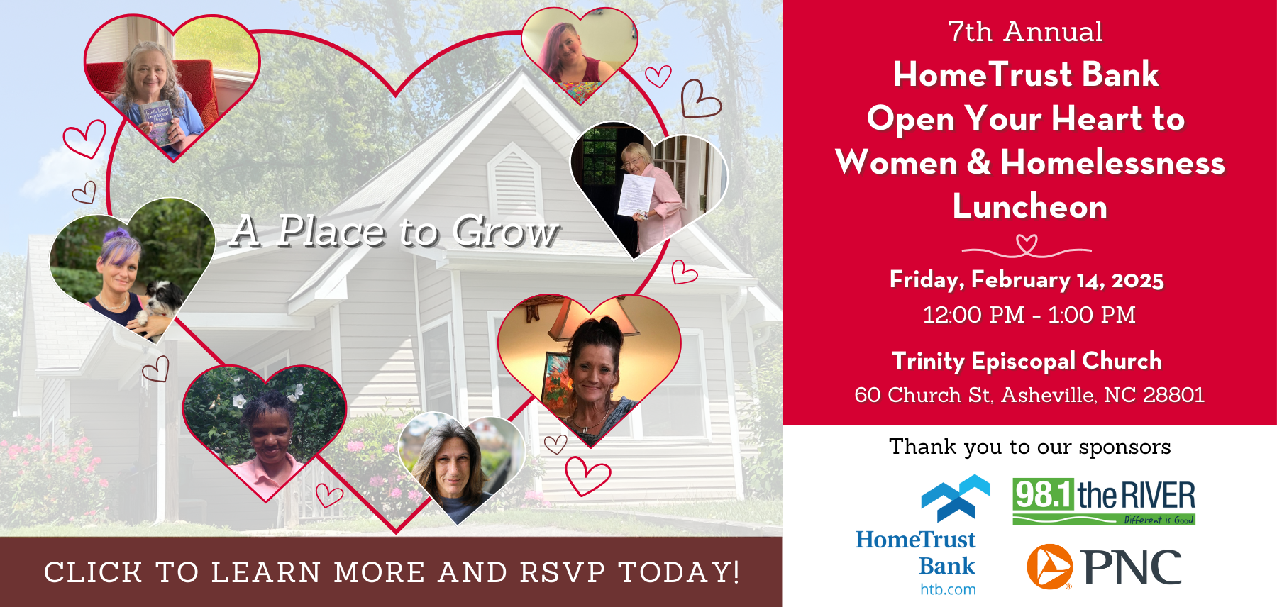 If you haven’t registered yet, there’s still time to RSVP to the 7th Annual HomeTrust Bank Open Your Heart to Women and Homelessness Luncheon on Valentine's Day, February 14, from 12:00 to 1:00 pm at Trinity Episcopal Church. The event is FREE and open to the community! Arrive early to chat, grab your seats, and enjoy a free lunch of sandwiches, soups, and salad.