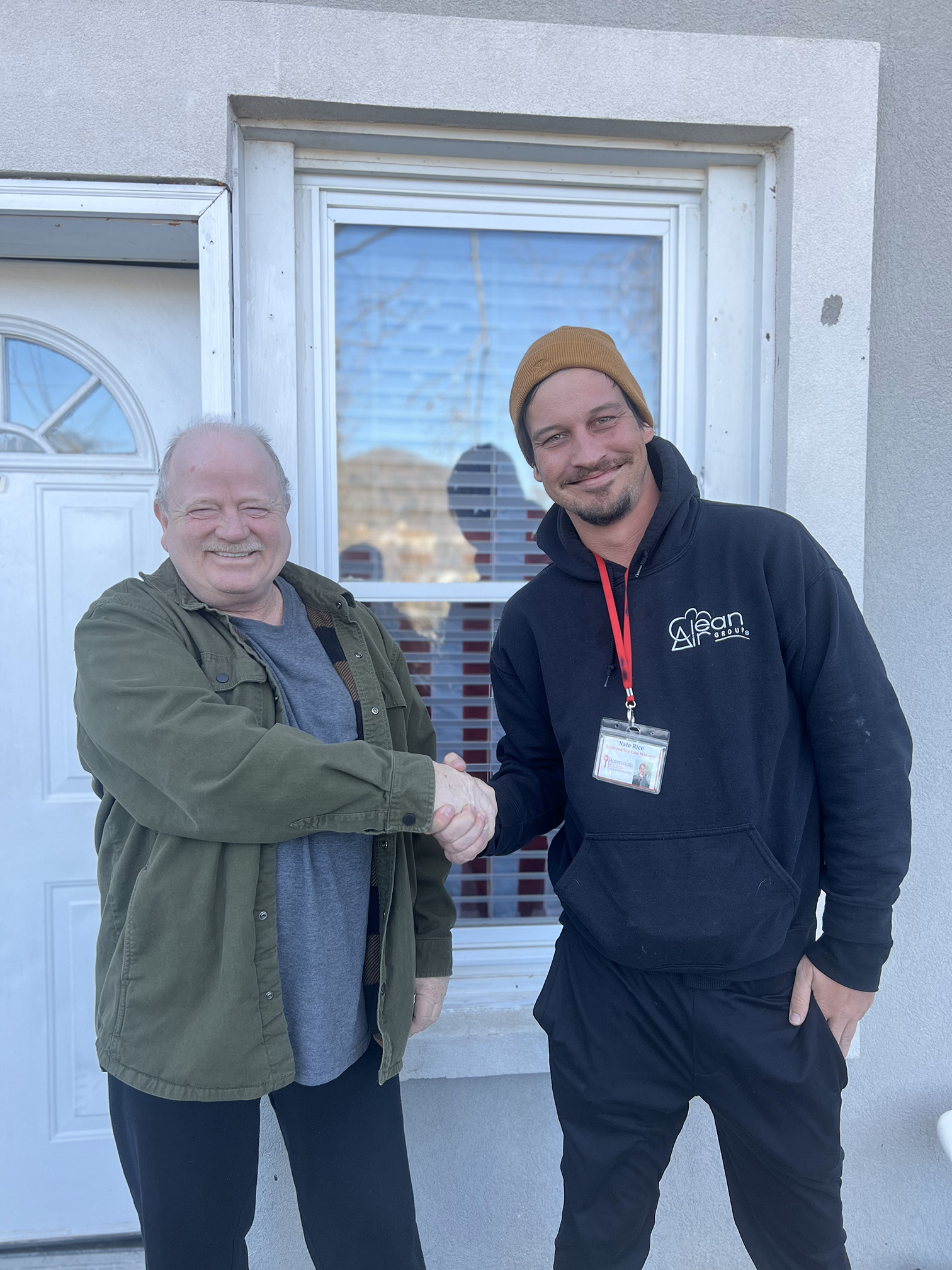 Matthew (left) and his Case Manager, Nate outside his new home. Matthew was housed with Homeward Bound for 8 years before Hurricane Helene destroyed his home in Swannanoa. |